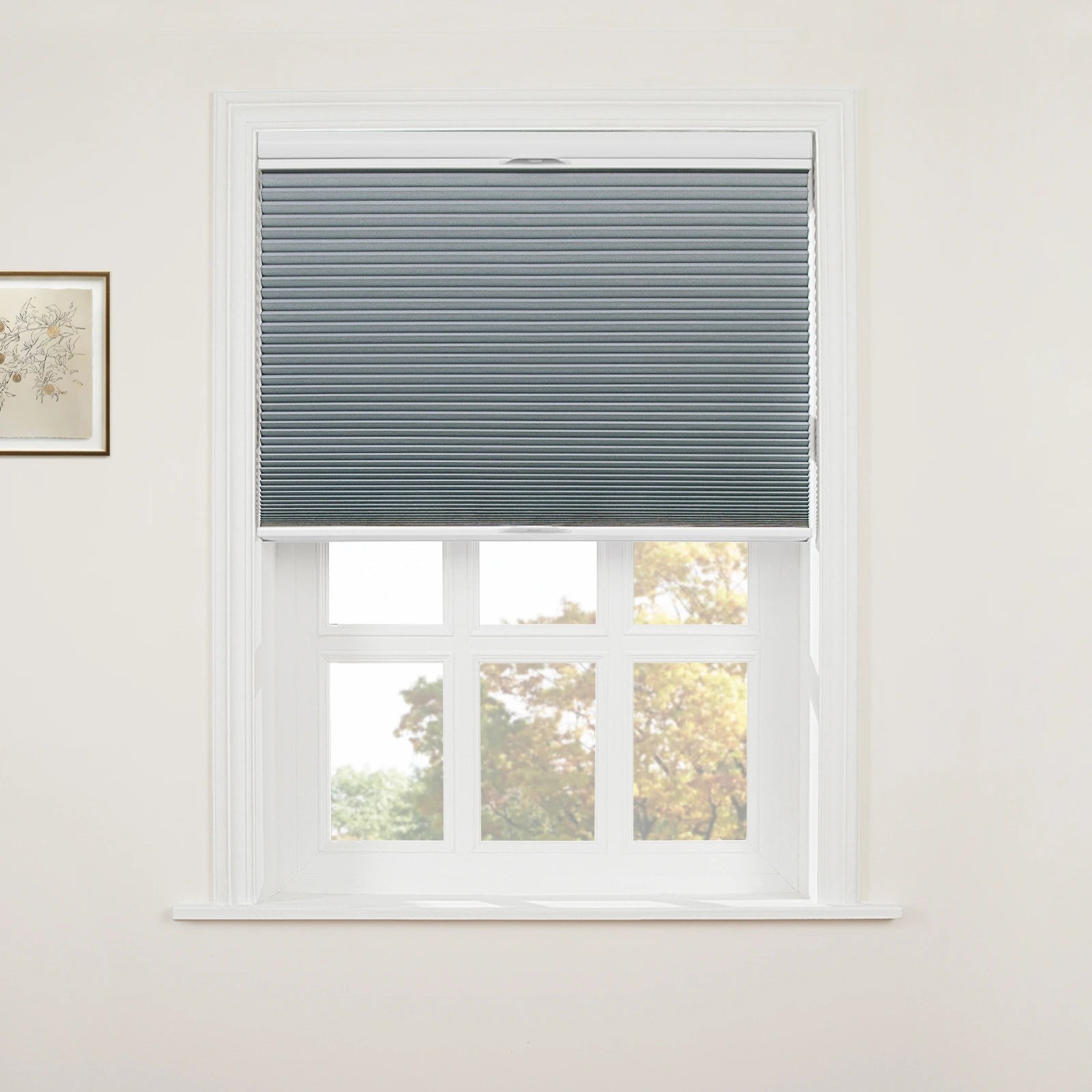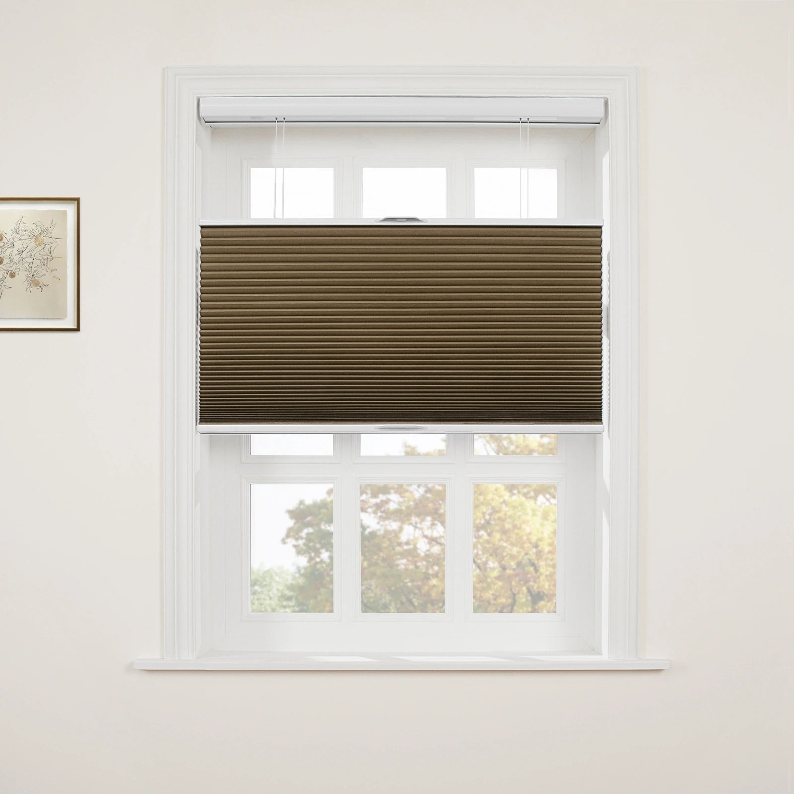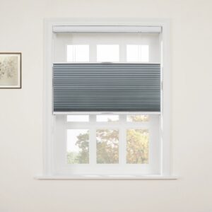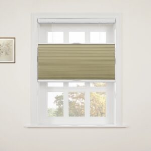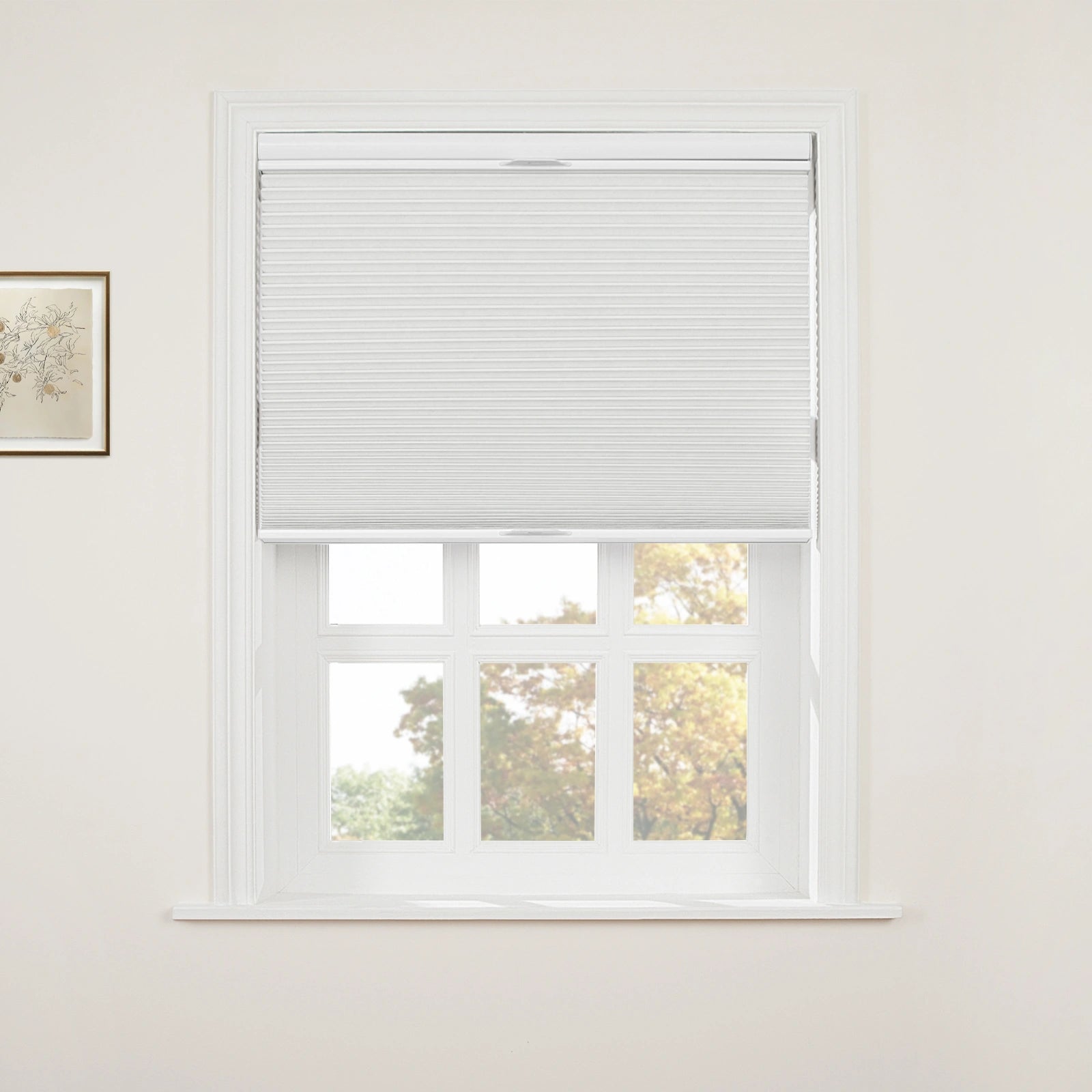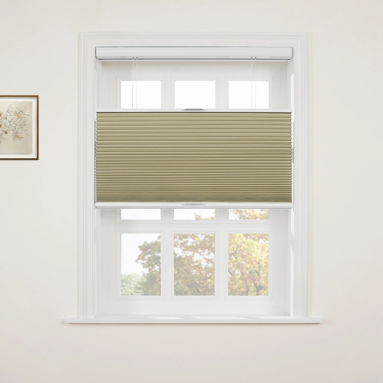 This product is a cordless cellular blind for interior window covering with top down and bottom up adjustment. It allows the blind to be positioned from the top or bottom to control light entry and privacy. The blind uses a honeycomb pleated fabric structure and a manual cordless lift system. The fabric is made of polyester with a weight of 225 g/m² and a pleat size of 2.54 cm. The headrail is made from aluminum alloy and requires a minimum mounting depth of 7 cm, or 6.35 cm for flush installation. This blind is suitable for use in living rooms, bedrooms, offices, and other indoor spaces to manage light, privacy, and window coverage.