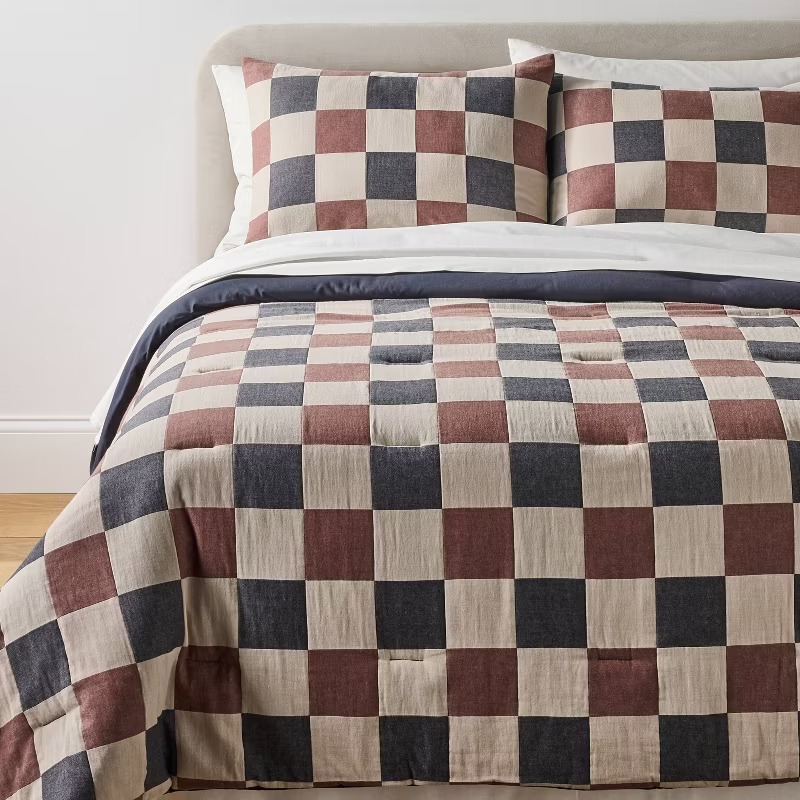 Baumwoll-Steppbett-Set mit gewebtem Karomuster und passenden Kissenbezügen für komfortables Schlafen.
