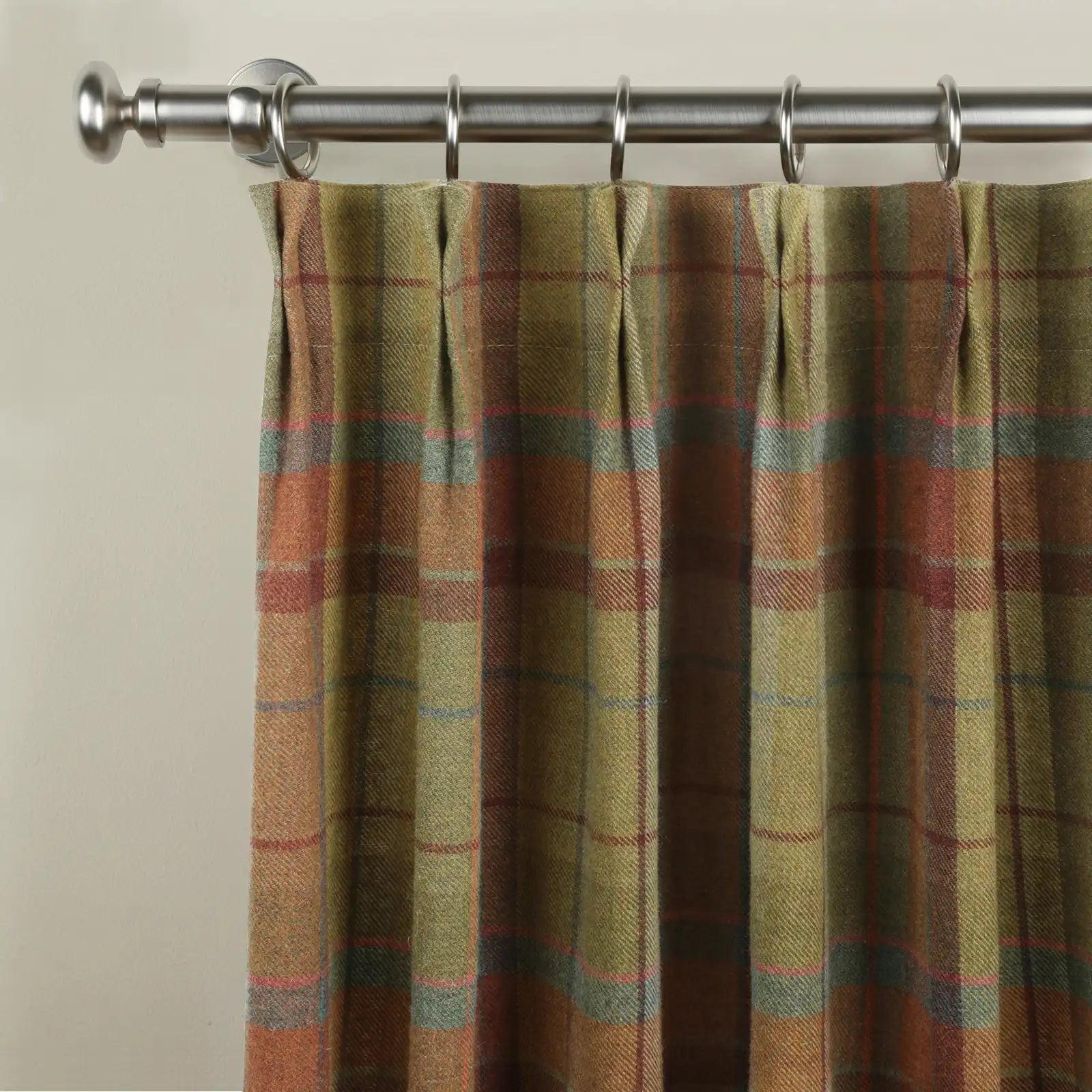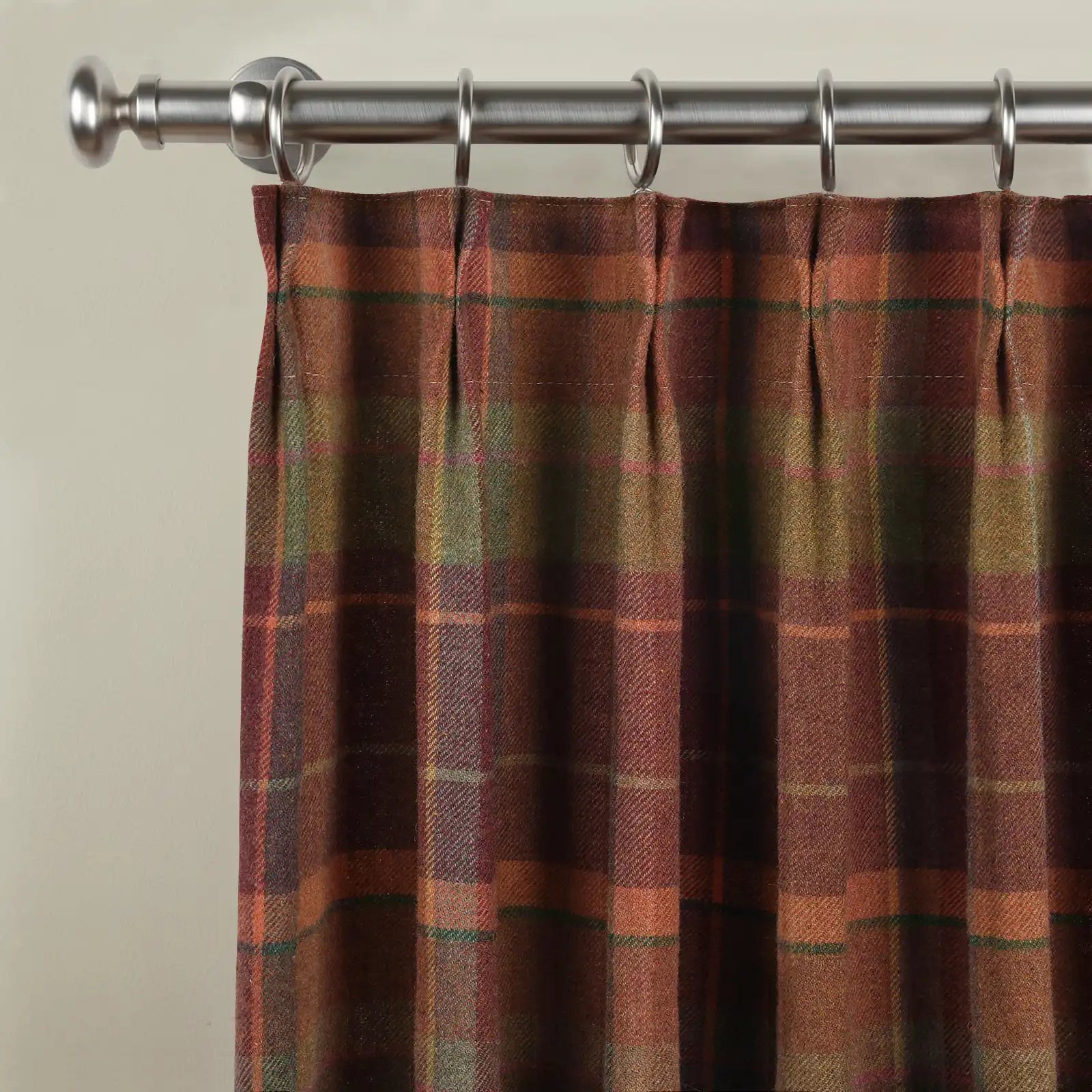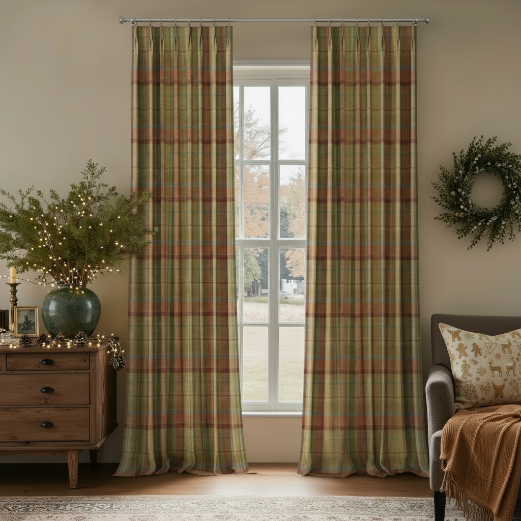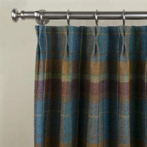- This product is a pleated thermal curtain panel made from woven wool fabric for interior window covering. It is designed with structured pleats to support an even drape when installed. The curtain uses a plaid pattern and is supplied as a single panel. The fabric is made from 100% wool with a medium weight of 275 g/m². The hem width is 3.8 cm, and the side pleat spacing is 5 cm from the hem to the first fold on each side. This curtain is suitable for use in living rooms, bedrooms, and other indoor spaces to provide window coverage, privacy, and light reduction.