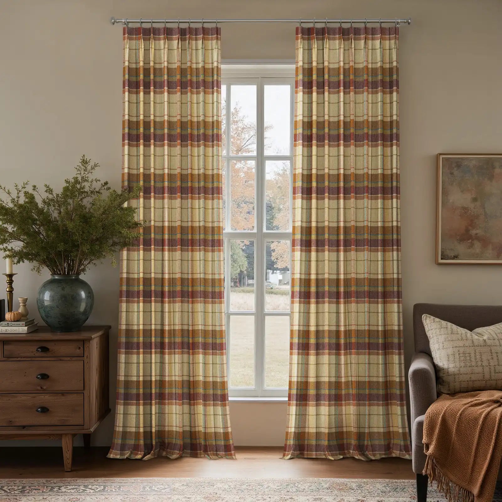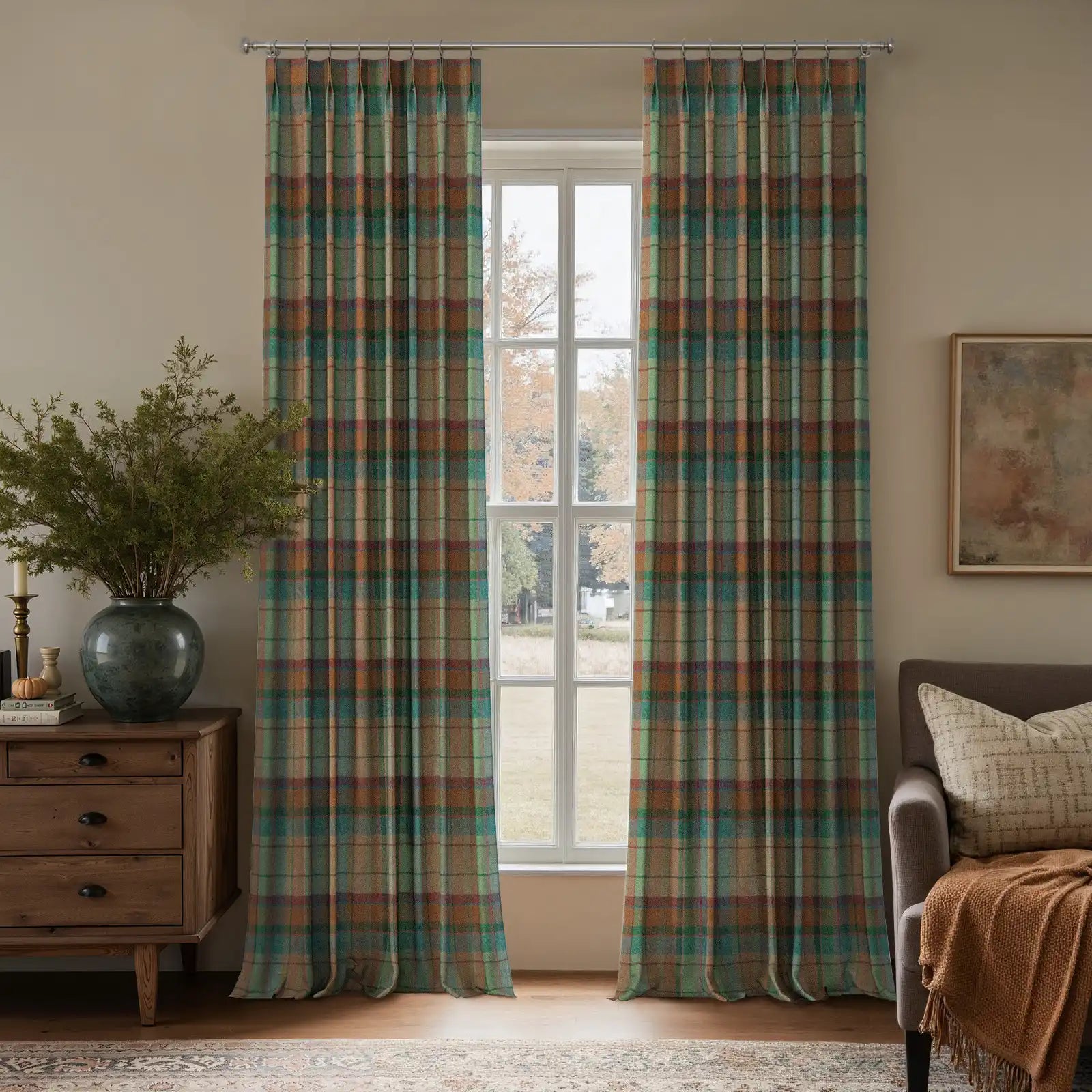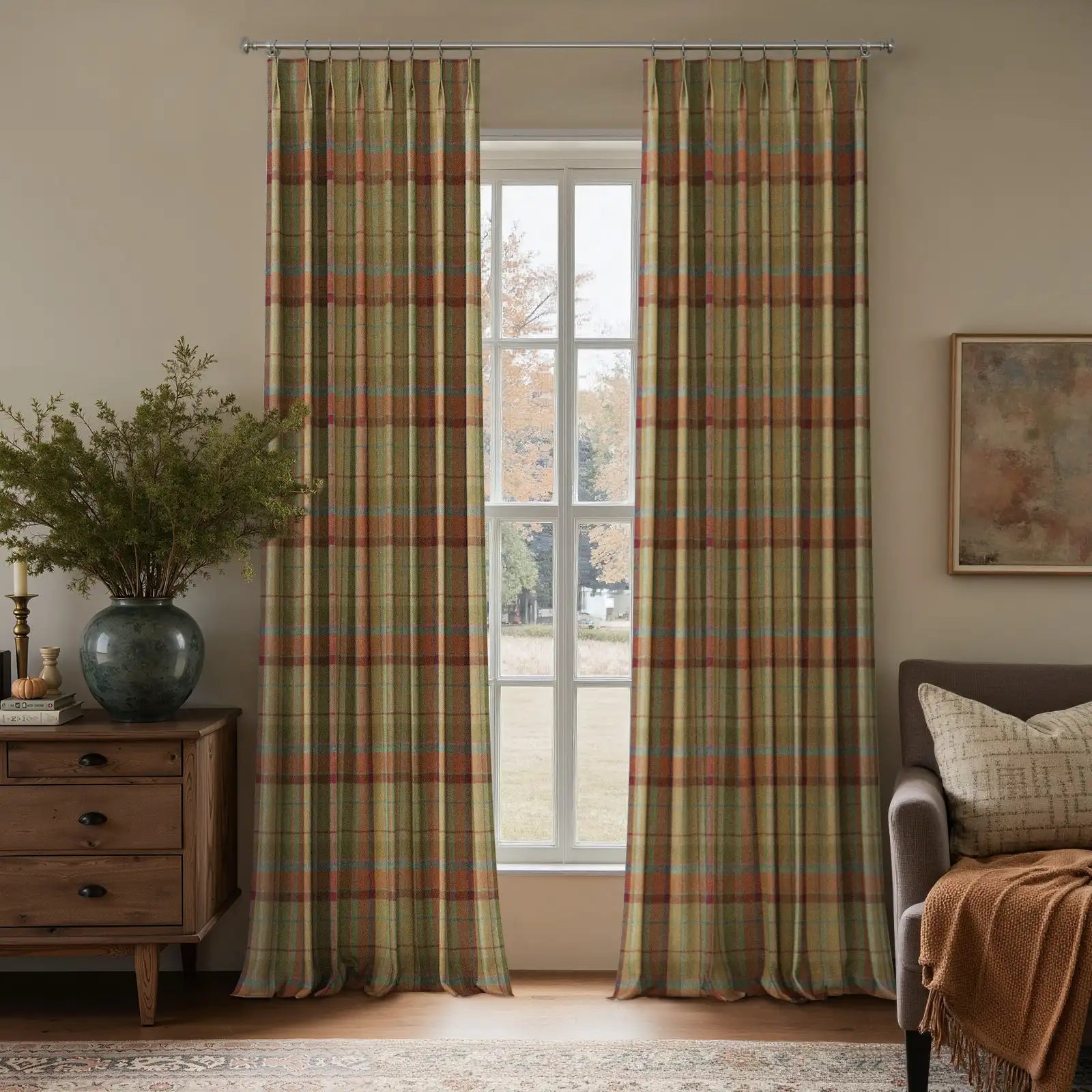 - This product is a pleated thermal curtain panel made from woven wool fabric for interior window covering. It is designed with structured pleats to support an even drape when installed. The curtain uses a plaid pattern and is supplied as a single panel. The fabric is made from 100% wool with a medium weight of 275 g/m². The hem width is 3.8 cm, and the side pleat spacing is 5 cm from the hem to the first fold on each side. This curtain is suitable for use in living rooms, bedrooms, and other indoor spaces to provide window coverage, privacy, and light reduction.