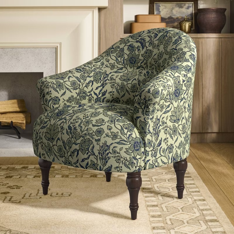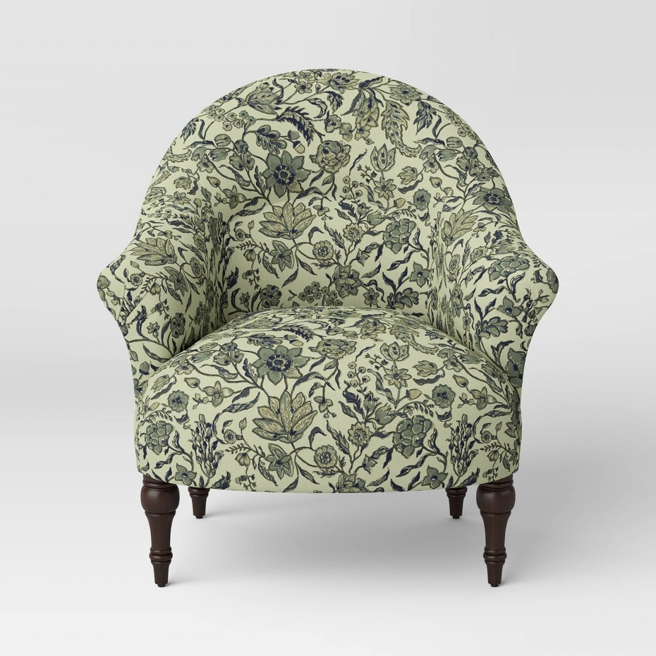 Dieser Polsterstuhl mit floralem Muster ist für den Einsatz in Wohnräumen konzipiert und dient als Sitzmöbel mit dekorativer Funktion. Er verfügt über eine gepolsterte Sitzfläche, eine geschwungene Rückenlehne im Wing-Design sowie hohe Armlehnen für zusätzlichen Halt.