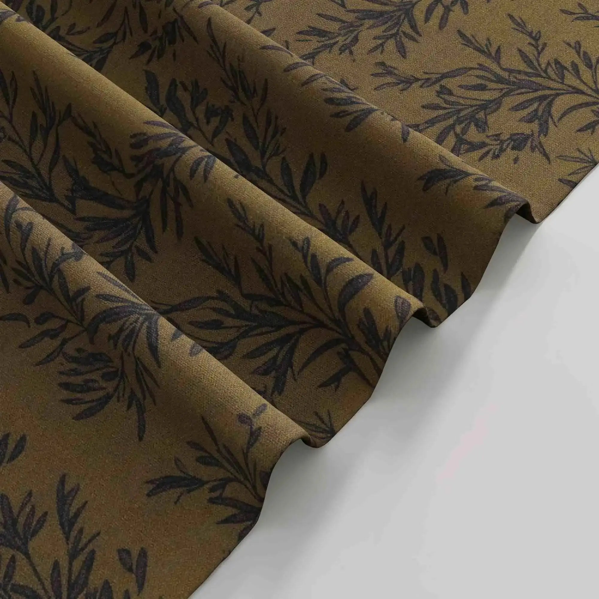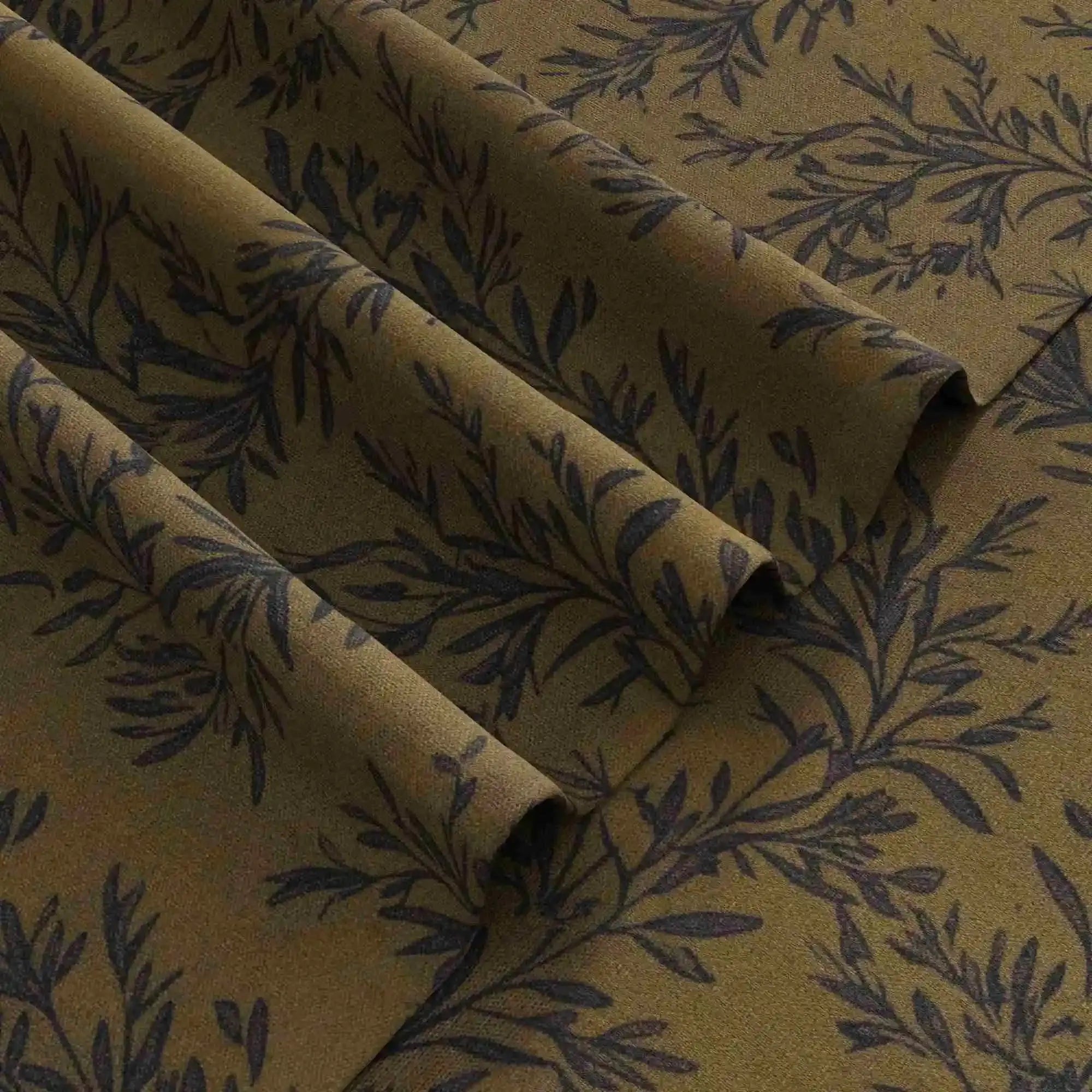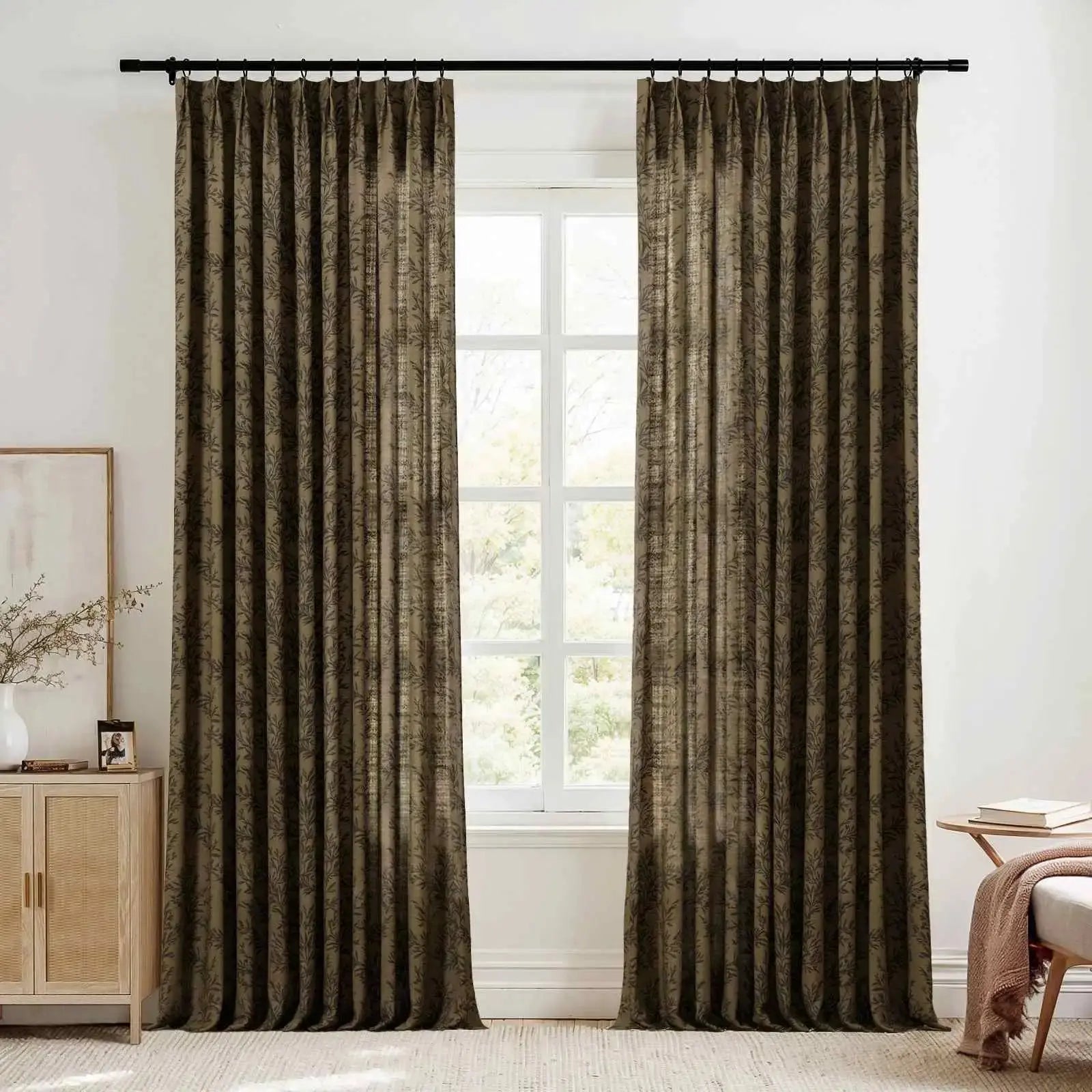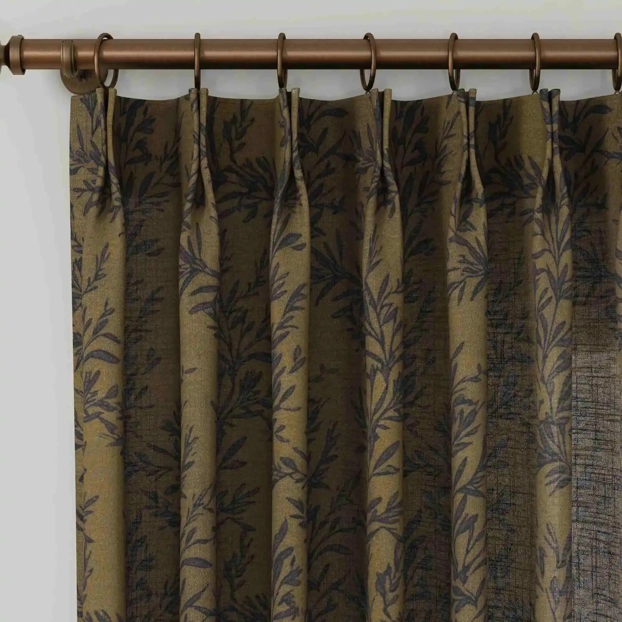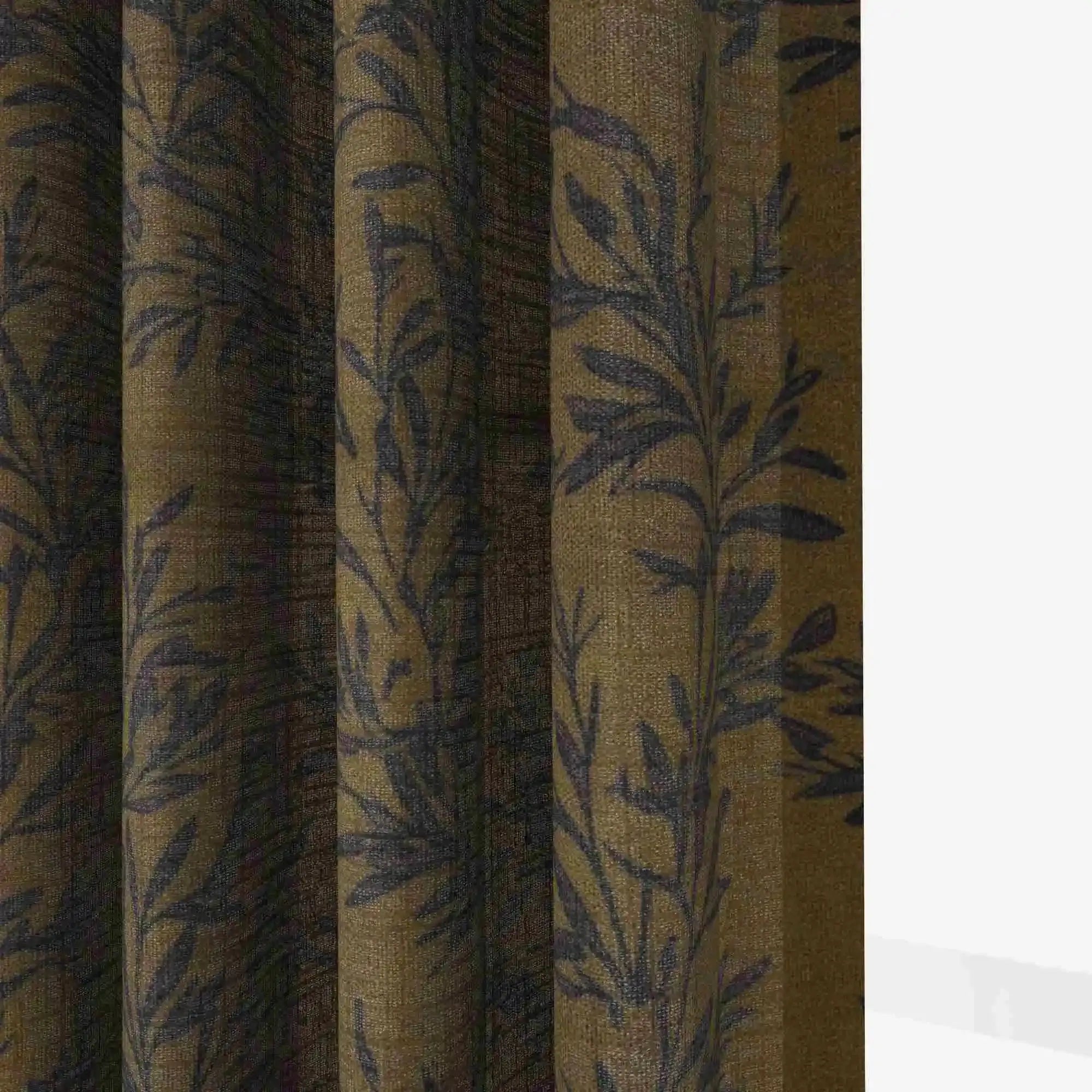 This product is an unlined pleated curtain panel with a leaf pattern for interior window covering. It is designed with a header tape for attachment to curtain rails or rods. The curtain is made from a woven fabric blend of 90% polyester and 10% linen with a fabric weight of 350 g/m². The hem width is 3.8 cm, and the side pleat spacing is 5 cm from the hem to the first fold on each side. The pattern is printed on the front side, with a plain reverse side of the same fabric structure. This curtain is suitable for use in living rooms, bedrooms, and home offices to provide decorative window coverage, privacy, and light filtering.